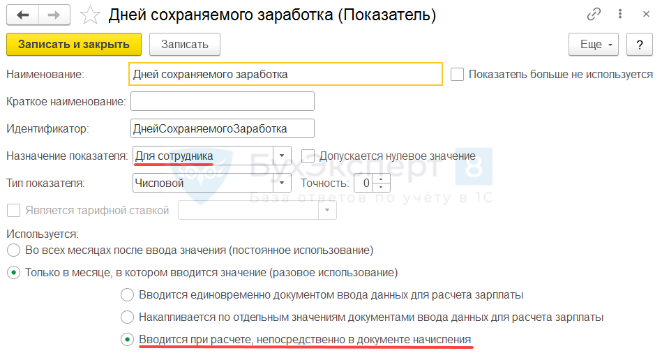 - число рабочих дней, за которые будем сохранять заработок. Создадим пользовательский Показатель. Настроим его, как назначаемый Для сотрудника и укажем, что значение показателя будем вводить непосредственно в документе расчета.