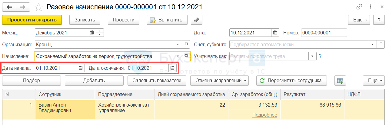 Зарегистрируем оплату сохраняемого заработка на время трудоустройства документом Разовое начисление. Период в документе укажем равный дате увольнения сотрудника (01.10.2021 г.). Это позволит подобрать сотрудника в документ и правильно определить расчетный период для расчета среднего заработка (12 месяцев перед увольнением). Количество дней сохранения заработка в документе укажем вручную.