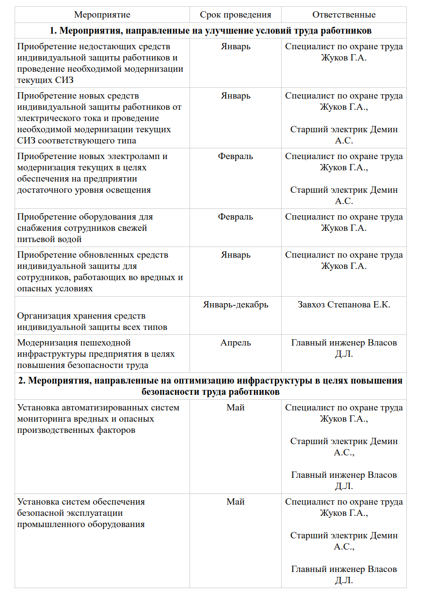 - запланированные мероприятия, которые обеспечат улучшение условий труда на предприятии;