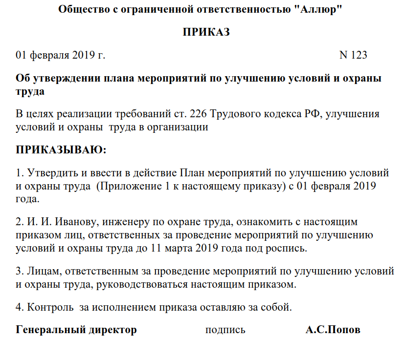 Все предложения и инициативы, нашедшие поддержку у руководства и коллектива, необходимо включить в план по улучшению условий и охраны труда. Обычно такой документ разрабатывают лица, ответственные за ОТ на предприятии, но утвердить его должен руководитель отдельным приказом.
