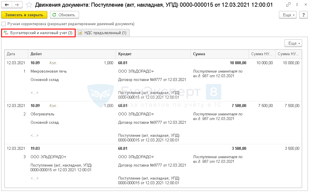 | 12 марта | 10.09 | 60.01 | 17 500 | 17 500 | 17 500 | Принятие к учету инвентаря | Поступление (акт, накладная, УПД) — Накладная, УПД |