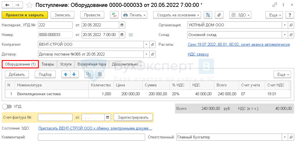 - Номенклатура — приобретаемое оборудование из справочника Номенклатура с Видом номенклатуры Оборудование к установке.