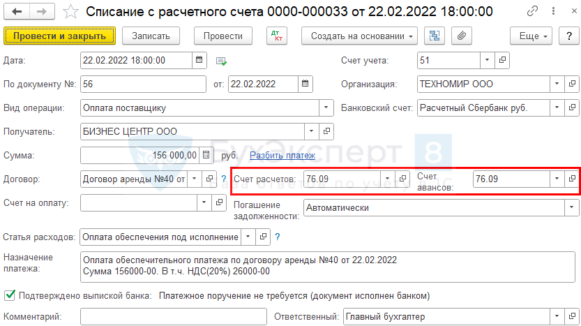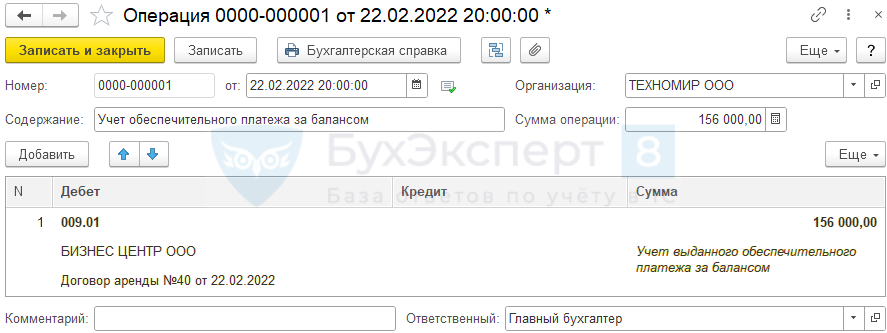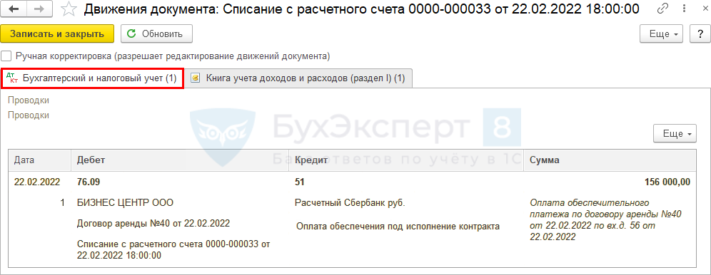 - Субконто 2 — договор, по которому был перечислен обеспечительный платеж, выбирается из справочника Договоры;