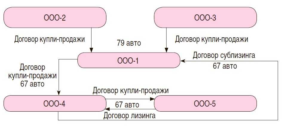 Налогоплательщик (назовем его ООО-1) приобрел у двух компаний (ООО-2 и ООО-3) 79 транспортных средств на общую сумму 286,5 млн руб. (в том числе НДС – 43,7 млн руб.). Произошло это в 2011 – 2012 годах. В начале 2013 года большая часть данных автомобилей (67 единиц) была реализована ООО-1 своему же учредителю – ООО-4 за 213 млн руб. (включая НДС). В тот же день ООО-4 заключило два договора с ООО-5. На основании договора купли-продажи транспортные средства были проданы ООО-5, которое, в свою очередь, вернуло их ООО-4 как лизингового имущества в соответствии с договором лизинга.