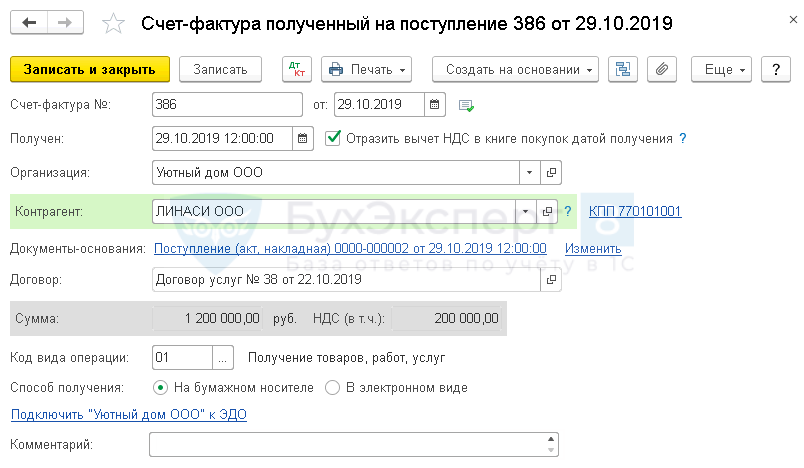 счет-фактура полученный, код вида операции «01».
