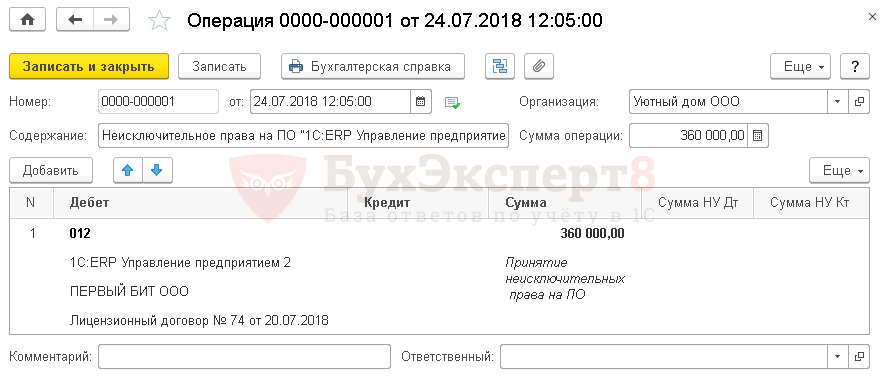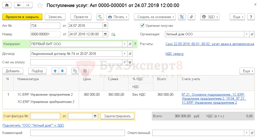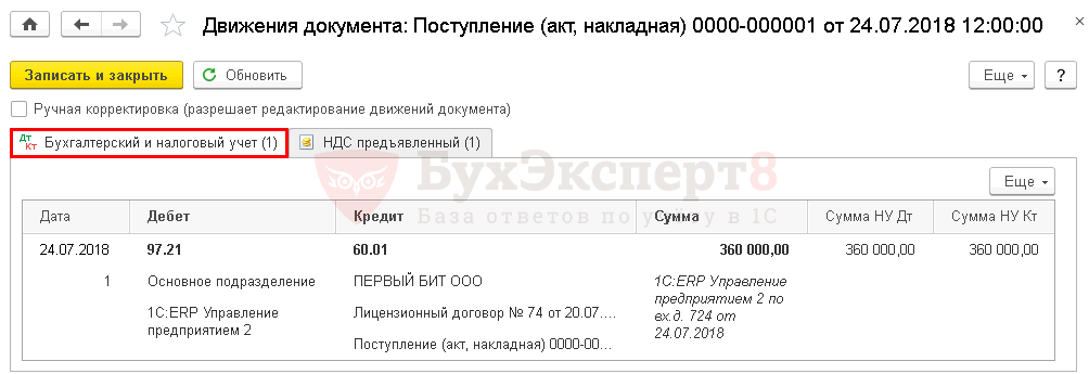Учет затрат на ПО (неисключительное право) отражается документом Поступление (акт, накладная) — Услуги (акт) в разделе Покупки — Покупки — Поступление (акты, накладные).