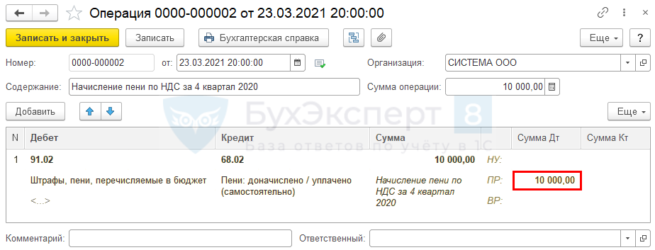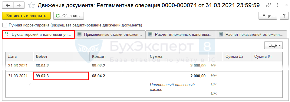 Сумма постоянного налогового расхода (ПНР) будет начислена регламентной операцией Расчет отложенного налога по ПБУ 18 в Дт 99.02.3 «Постоянное налоговое обязательство (актив)» при выполнении через Операции – Закрытие периода.