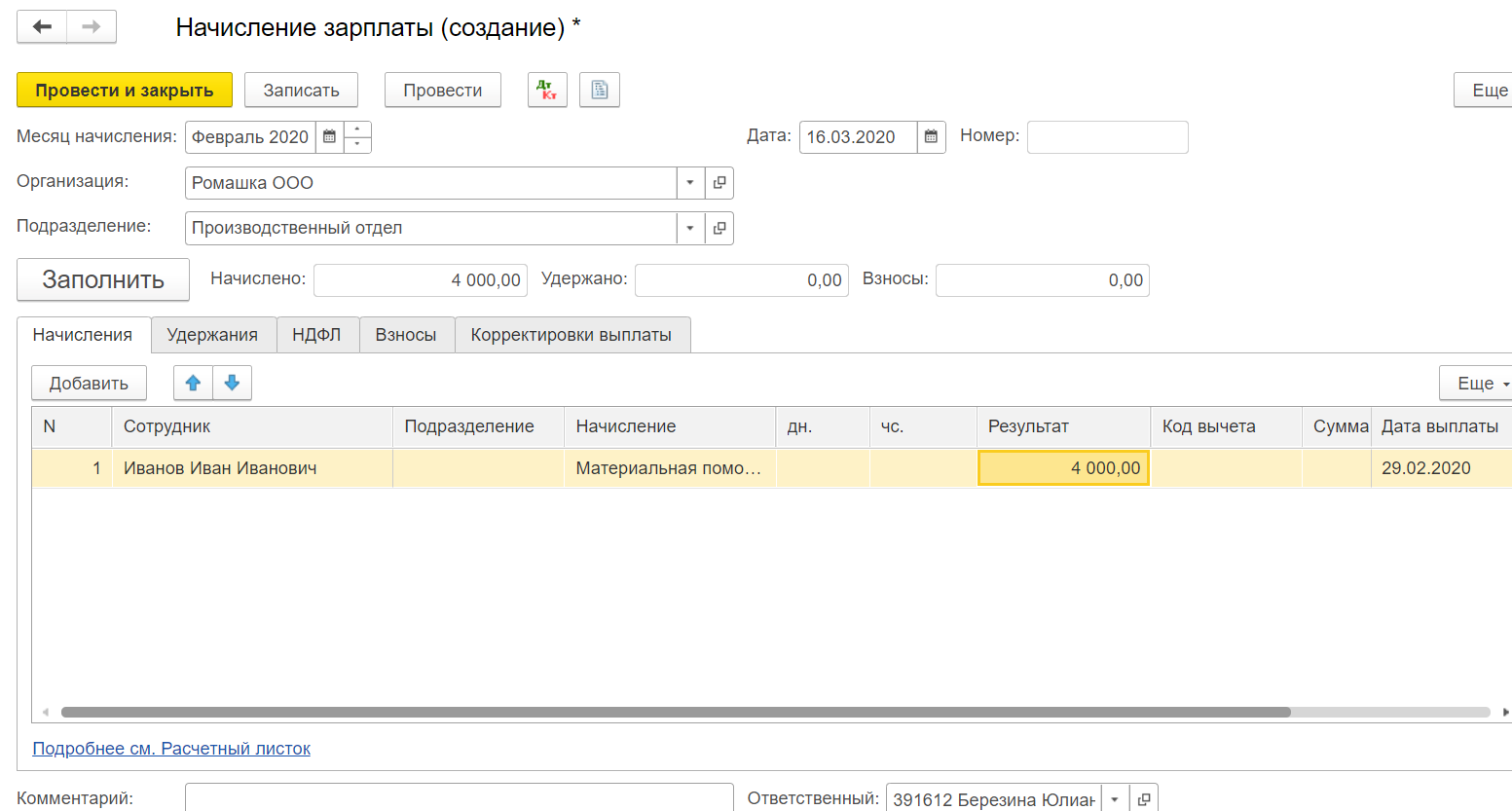 Проведем начисление материальной помощи сотруднику Иванову И.И. в связи с пожаром (чрезвычайной ситуацией). Программа 1С позволяет провести начисление как в отдельном документе, так и вместе с основной заработной платой сотрудника.