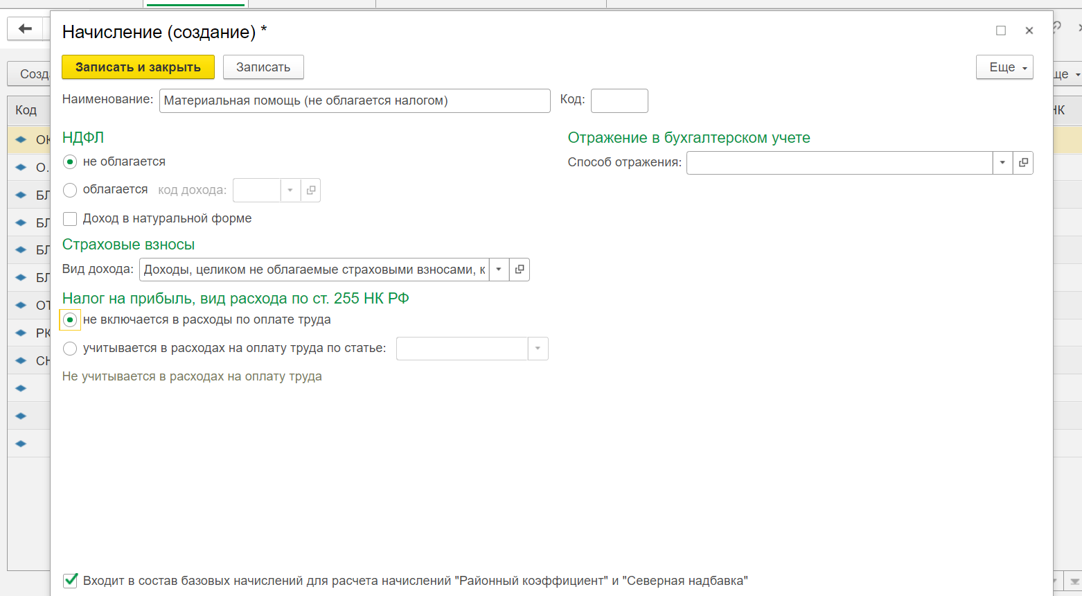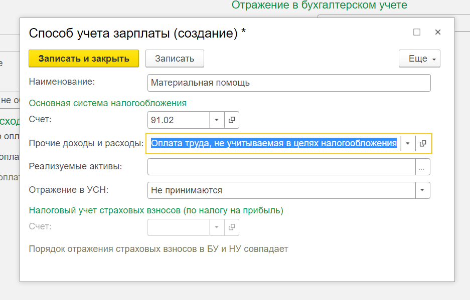 Для того чтобы сохранить способ учета, внимательно проверьте указанные данные и обратитесь к кнопке «Записать и закрыть». Аналогичным способом запишите новое начисление («Материальная помощь (не облагается налогом»).