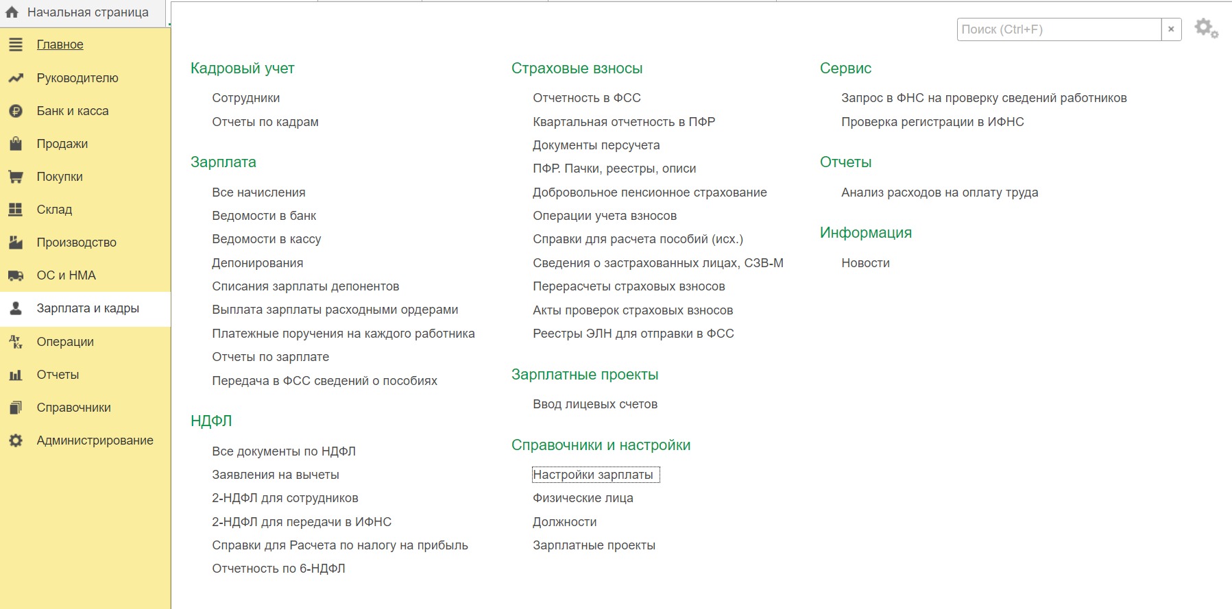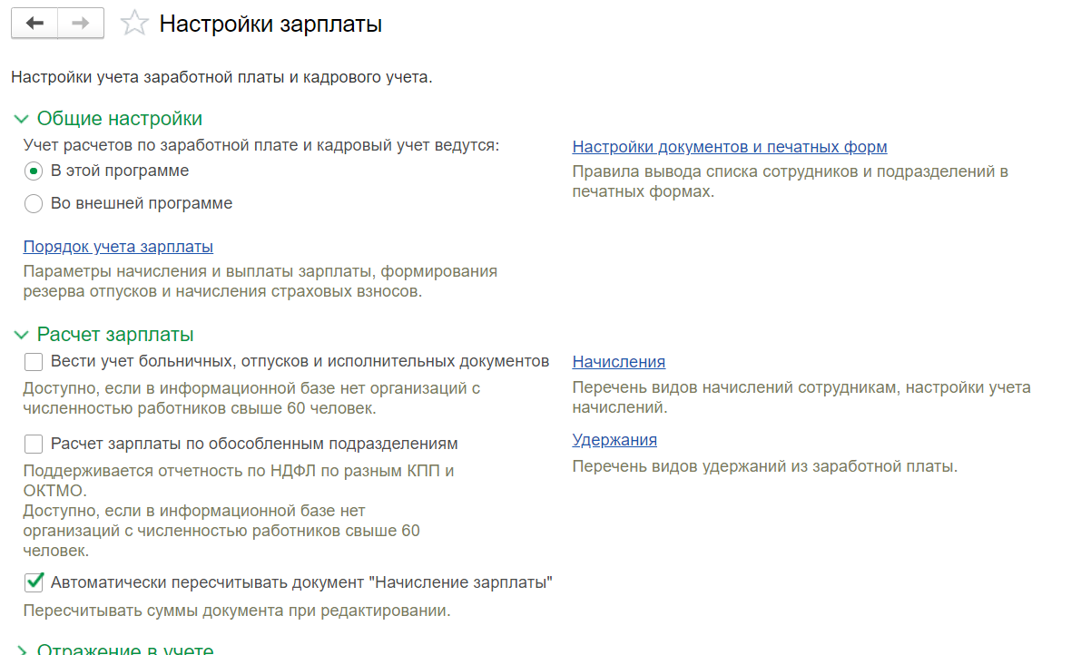 Первый шаг – создание нового вида расчетов с сотрудниками. Обратитесь к разделу «Зарплата и кадры», перейдите на вкладку «Настройки зарплаты».