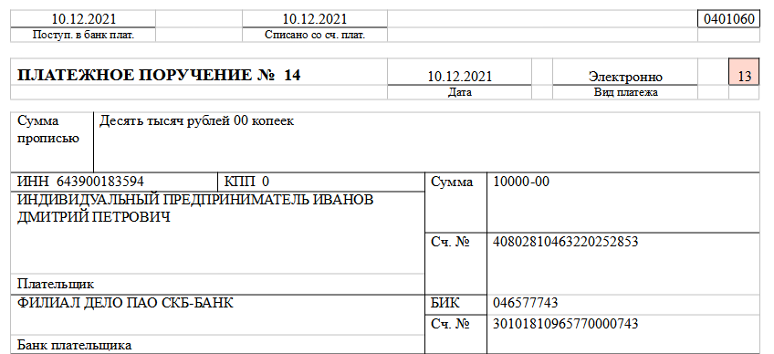 Дату документа нужно указывать в точном соответствии с основанием платежа в формате ДД.ММ.ГГГГ. Например, если предприниматель платит штраф по исполнительному листу от 01 декабря 2021 года, то в поле «Дата платежа» он указывает 01.12.2021. Если же вы просто платите налоги по декларации, в поле «Дата платежа» укажите дату ее подписания.