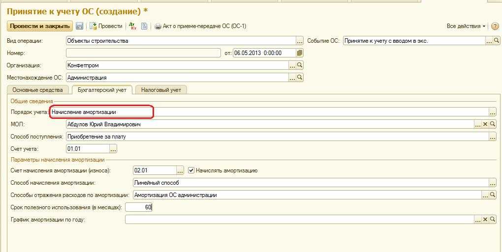 Далее необходимо перейти на закладку «Бухгалтерский учет». В поле «Порядок учета» выбираем «Начисление амортизации», после чего станут доступными на закладке реквизиты, которые обязательно нужно заполнить, чтобы амортизация была начислена адекватно. Это и «МОЛ», и «Способ поступления», и «Счет учета», «Счет начисления износа», «Способ начисления амортизации», «Способы отражения расходов по амортизации», сколько составляет срок полезного использования основного средства в месяцах.
