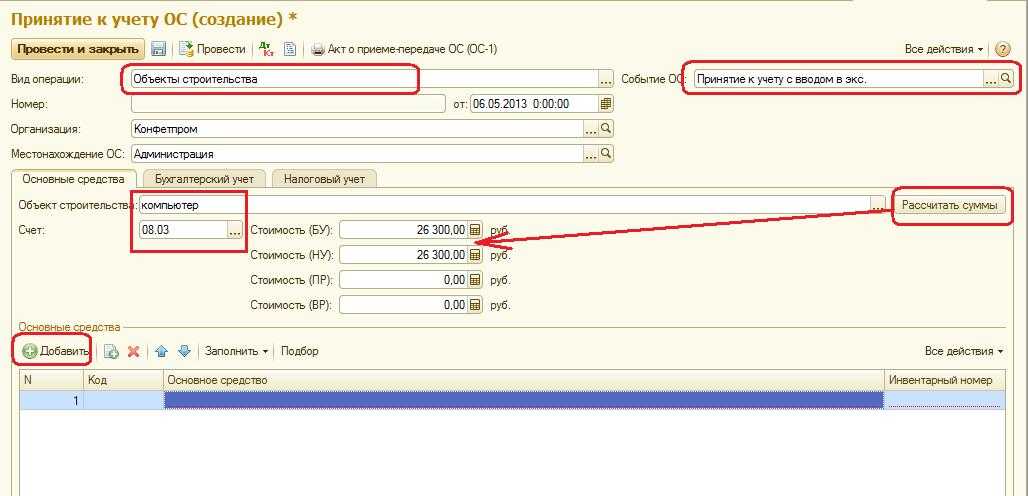 Там, где необходимо ввести объект строительства, выбираем «Компьютер», а справа от него располагается кнопка «Рассчитать суммы». После нажатия на нее программа автоматически сформирует первоначальную стоимость основного средства по налоговому и бухгалтерскому учету. Эту стоимость будет списано с дебета счета номер 08.03, объектом аналитического учета является «Компьютер» (свериться можно будет с оборотно-сальдовой ведомостью по счету 08.03).