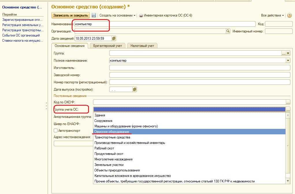 В поле «Наименование» следует указать «Компьютер», а если нажать на кнопку выбора строки «Группа учета ОС», то там нужно поискать определение «Офисное оборудование». Таким образом, вкладка «Основные средства» будет заполнена только частично. То есть такие поля, как «Группа», «Изготовитель», «Заводской номер», «Номер паспорта (регистрационный)», «Дата выпуска (постройки)» остаются незаполненными.