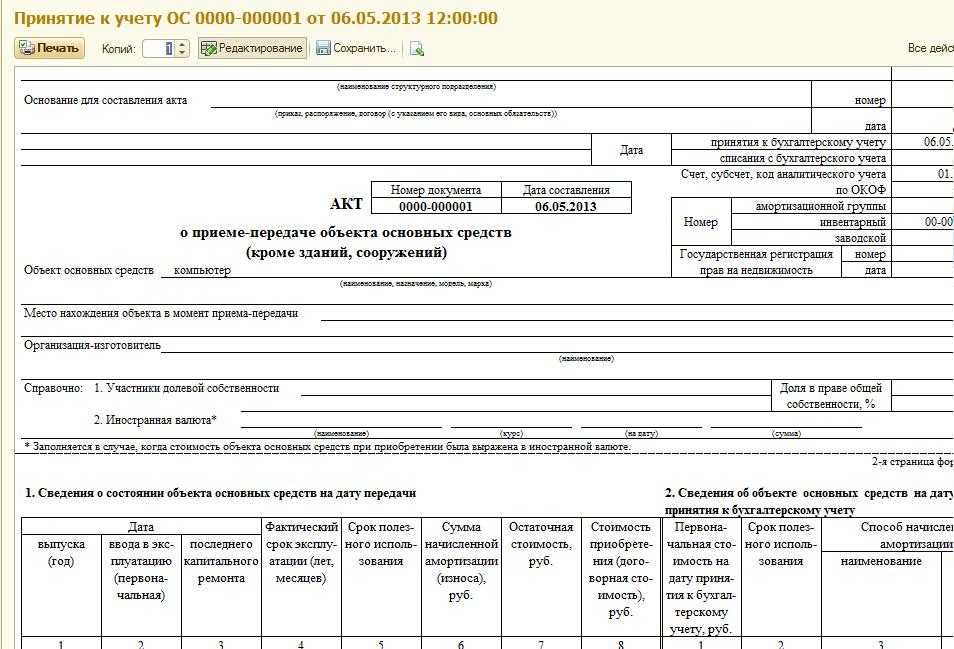 | Д 01 — К 08 | Компьютер принят к учету в качестве ОС | 41 000,00 | Акт о приеме-передаче объекта основных средств (кроме зданий, сооружений) (форма N ОС-1) |