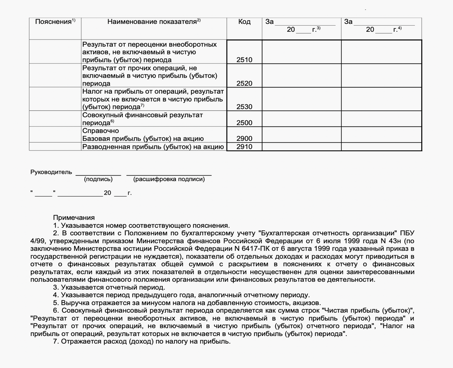 Бланк формы отчёта о финансовых результатах — таблица, над которой указаны: