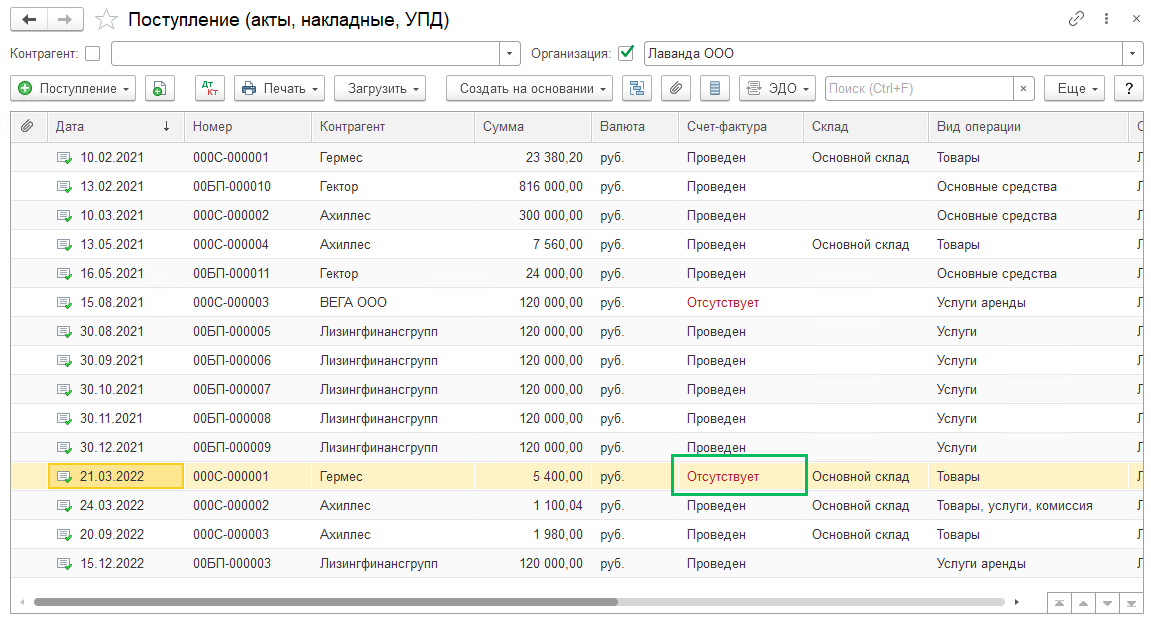 Проверьте также зарегистрированы ли все полученные от поставщиков счета-фактуры. Сделать это удобно из журнала документов Покупок. Имеется отдельная колонка, которая показывает регистрацию или отсутствие счета-фактуры по поступлению.