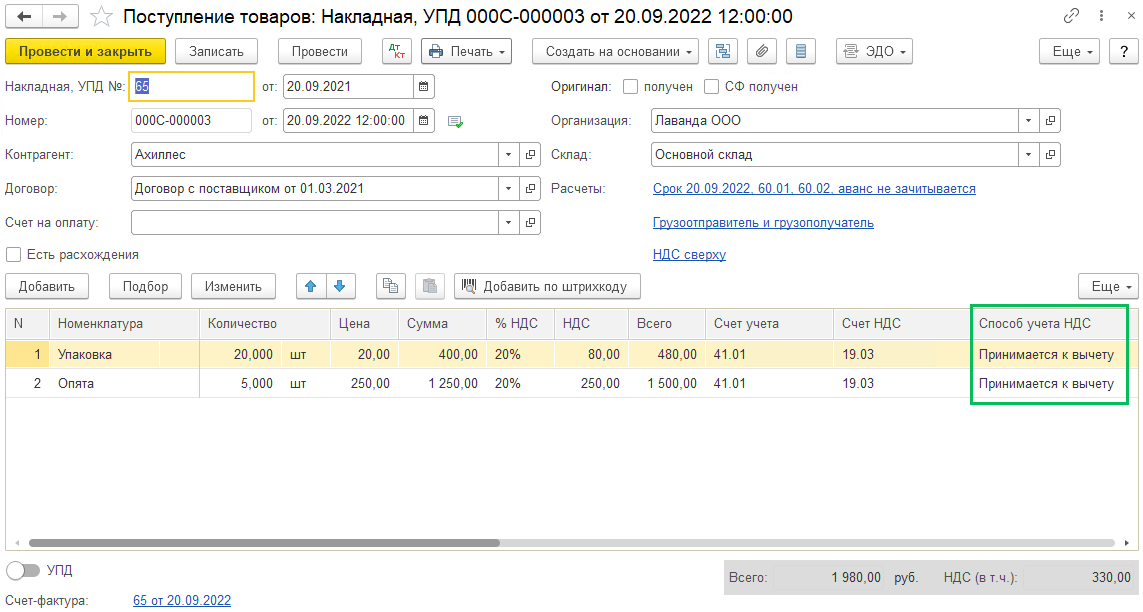 Если в организации ведется раздельный учет НДС, то проверьте правильность отражения Способа учета НДС в документах Поступления ТМЦ.