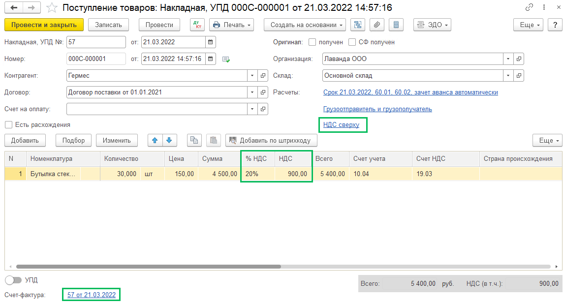 В документах на поступление товаров, работ, услуг и дополнительных расходов (раздел Покупки – Поступление (акты, накладные, УПД)) проверьте корректность заполнения колонок в табличной части % НДС и НДС. Определение расчета НДС сверху или в сумме указывается в шапке документа по гиперссылке НДС сверху/в сумме.