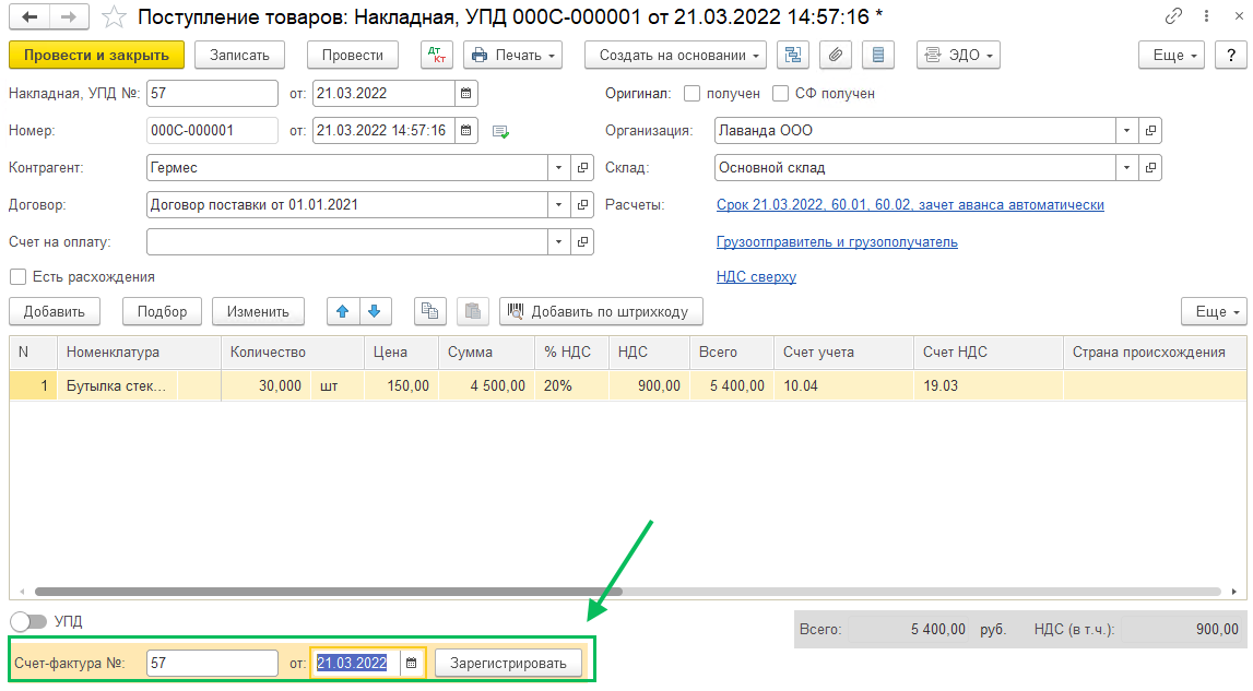 Если в каком-то из документов указано, что счет-фактура отсутствует, то пройдите в документ и зарегистрируйте счет-фактуру в нижней части документа. Для этого введите ее номер и дату и нажмите кнопку Зарегистрировать.