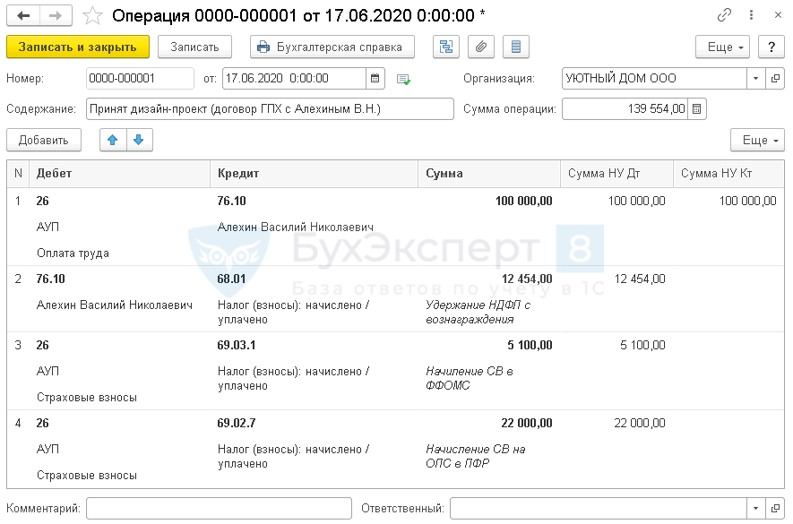 В нашем примере вознаграждение Алехина В.Н. учитывается на счете «Общехозяйственные расходы» и в налоговом учете относится к косвенным (прочим) расходам.