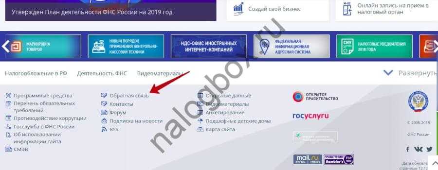 Если у вас нет ЛКН, то просто откройте сайт ведомства, спуститесь в самый нижний раздел главной страницы и перейдите по кнопке обратной связи.